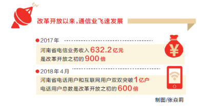 2017年,河南省電信業(yè)務(wù)收入632.2億元,是改革開放之初的900倍。2018年4月,河南省電話用戶和互聯(lián)網(wǎng)用戶雙雙突破1億戶,電話用戶總數(shù)是改革開放之初的600倍,實現(xiàn)了歷史性跨越。