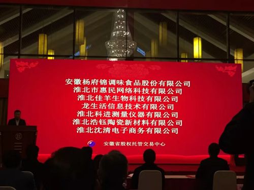 掛牌儀式上,安徽省股權(quán)托管交易中心為地處淮北市的安徽楊府錦調(diào)味食品股份有限公司、淮北市惠民網(wǎng)絡(luò)科技有限公司、淮北佳羊生物科技有限公司、龍生活信息技術(shù)有限公司、淮北科進(jìn)測(cè)量?jī)x器有限公司、淮北浩鈺陶瓷新材料有限公司、淮北沈清電子商務(wù)有限公司等35家公司集中授牌。