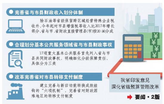 本報濟南1月14日訊 近日,省政府印發(fā)《關于深化省以下財政管理體制改革的實施意見》,進一步理順省與市縣財政收入劃分體制,加快建立權責清晰、財力協調、區(qū)域均衡的省與市縣財政關系。意見明確,八大類17項重大基本公共服務首先列入省與市縣共同財政事權范圍,將省財政直管縣范圍調整擴大到41個縣(市)。