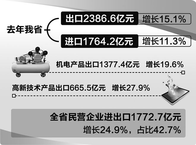 據(jù)介紹,去年我省出口2386.6億元,增長(zhǎng)15.1%;進(jìn)口1764.2億元,增長(zhǎng)11.3%。以美元計(jì)價(jià),進(jìn)出口629.7億美元,增長(zhǎng)16.6%。其中,出口362.1億美元,增長(zhǎng)18.3%;進(jìn)口267.6億美元,增長(zhǎng)14.3%。整體看,我省外貿(mào)排名全國(guó)第13位,提高1位,超越廣西。全年出口增速位居全國(guó)第8位,為近5年來最快,快于上年4.9個(gè)百分點(diǎn)。