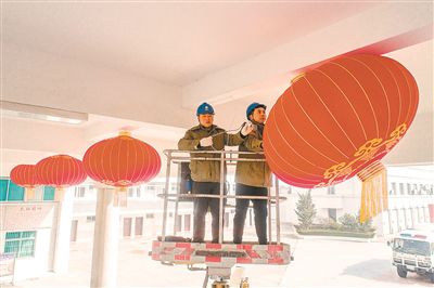 泰 州 4日,電力搶修人員接電掛燈籠。 湯德宏 楊玉崗攝