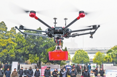 上圖:公安民警在鄭州市紫荊山公園為市民展示警用無人機。新華社發(fā)