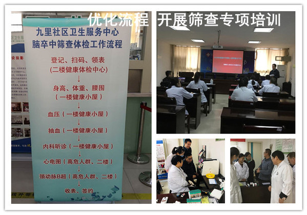 篩查項(xiàng)目啟動(dòng)后,徐醫(yī)附院醫(yī)務(wù)處組織人員前往九里社區(qū)衛(wèi)生服務(wù)中心開(kāi)展了為其一周的專(zhuān)項(xiàng)培訓(xùn),從篩查項(xiàng)目介紹、流行病學(xué)調(diào)查方案、篩查技術(shù)方案、實(shí)驗(yàn)室檢查、影像學(xué)檢查、直報(bào)系統(tǒng)對(duì)接等多個(gè)方面進(jìn)行了詳細(xì)的介紹。經(jīng)過(guò)系統(tǒng)培訓(xùn)后,九里社區(qū)衛(wèi)生服務(wù)中心通過(guò)優(yōu)化篩查流程,在門(mén)診一樓通過(guò)問(wèn)詢、體格檢查、實(shí)驗(yàn)室檢查發(fā)現(xiàn)高危人群。高危人群被標(biāo)識(shí)后,醫(yī)務(wù)人員會(huì)立即告知體檢人員已被視為高危人群,并通知導(dǎo)醫(yī)引領(lǐng)至門(mén)診二樓,繼續(xù)完成心電圖檢查和頸動(dòng)脈彩超檢查,檢查結(jié)果即刻告知,并根據(jù)報(bào)告結(jié)果采取多種干預(yù)手段,將腦卒中防治關(guān)口進(jìn)一步提前。