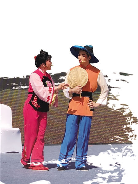 ▲韓國留學生李泰根(右)與柳琴劇院國家一級演員劉敏合作表演經典柳琴戲《喝面葉》