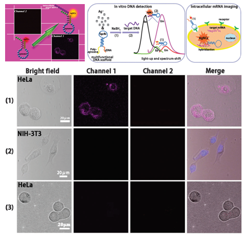 基于適配體功能化銀納米簇的腫瘤細(xì)胞內(nèi)mRNA熒光成像檢測(cè)示意圖(上);HeLa細(xì)胞和NIH-3T3細(xì)胞分別與cTK1-NC Sgc8c-L5T穩(wěn)定銀納米簇和mutated cTK1-NC Sgc8c-L5T穩(wěn)定銀納米簇作用后的激光共聚焦掃描圖像(下)