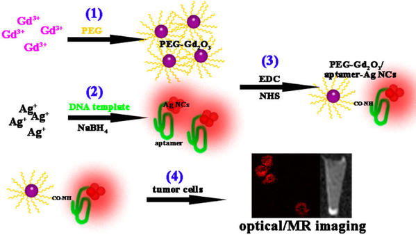 以氧化釓和適配體功能化銀納米簇為基礎(chǔ)的多模態(tài)分子成像納米探針用于腫瘤細(xì)胞的熒光-MRI成像。