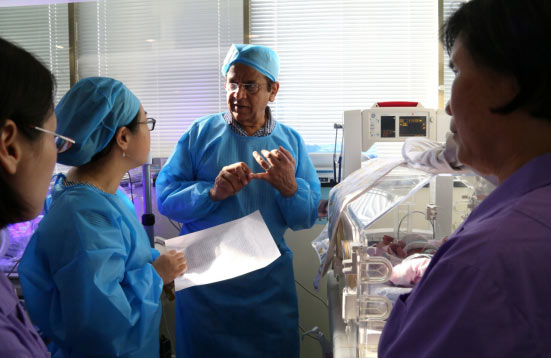 報(bào)告結(jié)束后,RAM教授在葛書記、兒科主任鄧曉毅的陪同下參觀了醫(yī)院的新生兒醫(yī)學(xué)中心,查看了一名出生體重僅為700克的超未成熟兒,并對(duì)目前的治療方案給予了充分的肯定。查房結(jié)束后,RAM教授與醫(yī)護(hù)人員就各自感興趣的問題進(jìn)行了廣泛交流和探討。