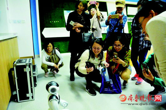 ◥5月18日,本報(bào)走進(jìn)山大青島校區(qū),在機(jī)器人實(shí)驗(yàn)室,學(xué)生和家長(zhǎng)正好奇地圍著機(jī)器人NAO拍照。