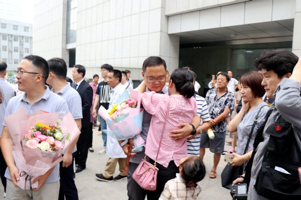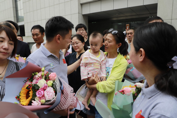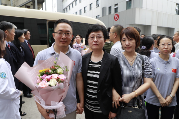 援外隊(duì)員出發(fā)前和家人相擁道別。