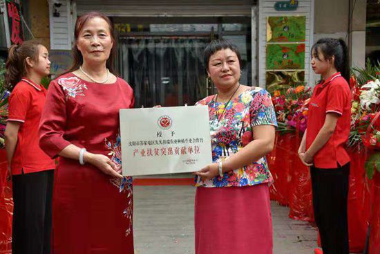 開業(yè)慶典活動上,遼寧省扶貧協(xié)會會長韓家清女士親臨現(xiàn)場,并為該公司頒發(fā)“遼寧省扶貧協(xié)會扶貧項目牌匾”、“產(chǎn)業(yè)扶貧突出貢獻單位獎”;為該公司總經(jīng)理任麗杰女士頒發(fā)了“遼寧省扶貧協(xié)會副會長榮譽證書”。