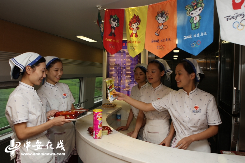 列車吧臺餐飲服務(wù)員為旅客選送小食品。(陸應(yīng)果)