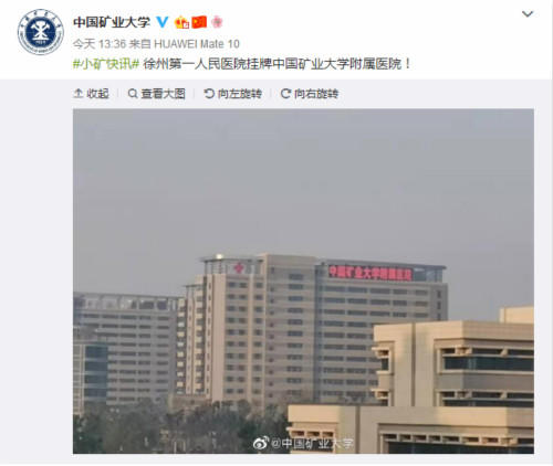 中國礦業(yè)大學(xué)官方微博發(fā)布消息,徐州第一人民醫(yī)院掛牌中國礦業(yè)大學(xué)附屬醫(yī)院。