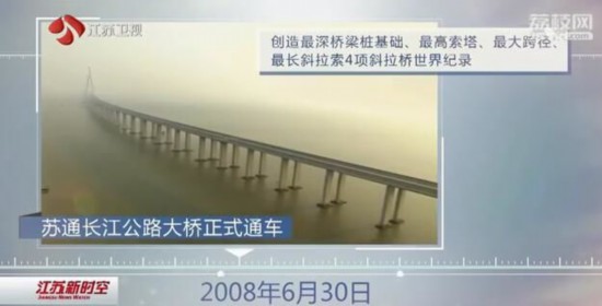 2008年6月30日,蘇通長(zhǎng)江公路大橋正式通車,創(chuàng)造最深橋梁樁基礎(chǔ)、最高索塔、最大跨徑、最長(zhǎng)斜拉索4項(xiàng)斜拉橋世界紀(jì)錄。