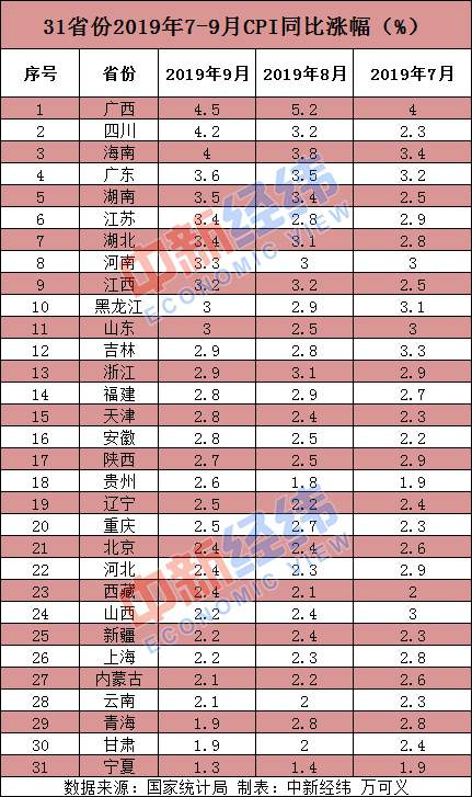 分省份來(lái)看,廣西、四川、海南、廣東等9省份9月份CPI同比漲幅超過全國(guó)平均水平,黑龍江、山東兩地漲幅與全國(guó)持平,吉林、河北、寧夏等20省份漲幅低于全國(guó)。其中,廣西壯族自治區(qū)9月份CPI同比上漲4.5%,連續(xù)三個(gè)月全國(guó)領(lǐng)漲;寧夏回族自治區(qū)CPI同比上漲1.3%,漲幅全國(guó)最低。