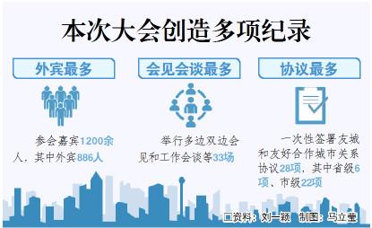 據(jù)統(tǒng)計(jì),大會(huì)參會(huì)中外嘉賓共計(jì)1200余人,其中外賓886人;舉行多邊雙邊會(huì)見和工作會(huì)談等活動(dòng)33場(chǎng),各參會(huì)團(tuán)組還分赴省內(nèi)各市參觀考察,掀起友城活動(dòng)小高潮。本次大會(huì)創(chuàng)造了多項(xiàng)紀(jì)錄。省外辦主任蔡先金介紹,一是外賓人數(shù)之多,創(chuàng)造紀(jì)錄,為我省歷年來(lái)主場(chǎng)外事歷史之最;二是一次大活動(dòng)內(nèi)的雙多邊會(huì)見和工作會(huì)談場(chǎng)次之多,創(chuàng)歷史新高;三是一次性簽署友城和友好合作城市關(guān)系協(xié)議28項(xiàng),其中省級(jí)6項(xiàng)、市級(jí)22項(xiàng),為歷年最多,還簽署了雙招雙引合作項(xiàng)目協(xié)議12項(xiàng),中小企業(yè)合作意向42項(xiàng);四是與會(huì)友城達(dá)成共識(shí),形成《濟(jì)南倡議》,為歷史首次;五是在濟(jì)南、青島共同舉辦面向民眾的國(guó)際友城商品展,也是第一次。