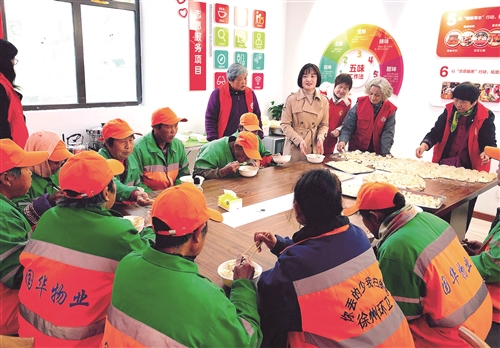 云龍區(qū)大龍湖街道昆侖社區(qū)志愿者為物業(yè)保潔和轄區(qū)環(huán)衛(wèi)工人包餃子。