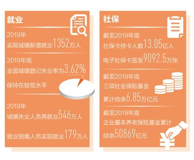 ——主要指標(biāo)表現(xiàn)良好。全年實(shí)現(xiàn)城鎮(zhèn)新增就業(yè)1352萬(wàn)人,繼續(xù)保持在1300萬(wàn)人以上;2019年底全國(guó)城鎮(zhèn)登記失業(yè)率為3.62%,保持在較低水平。