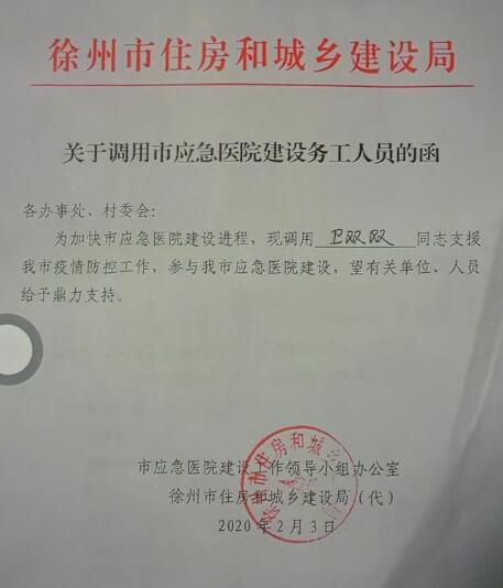 衛(wèi)雙雙的老家在河南洛陽(yáng)嵩縣車(chē)村鎮(zhèn),2號(hào)接到參加徐州應(yīng)急病房建設(shè)工程的通知以后,3號(hào)啟程奔赴徐州,沒(méi)想到在當(dāng)?shù)剜l(xiāng)鎮(zhèn)交界處受到了阻攔。情急之下,衛(wèi)雙雙給徐州市應(yīng)急醫(yī)院建設(shè)領(lǐng)導(dǎo)小組辦公室打電話,辦理了調(diào)用務(wù)工人員的函,這才順利來(lái)到施工工地。