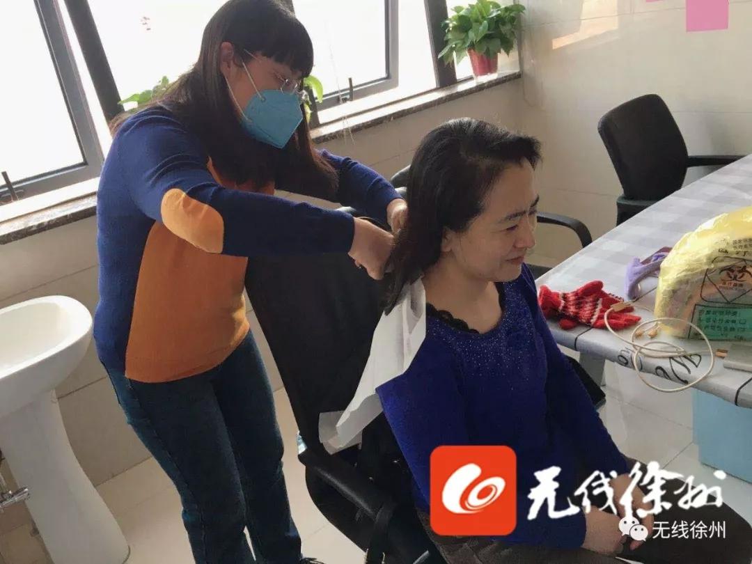 出發(fā)前,徐州市第一人民醫(yī)院骨科護(hù)士長(zhǎng)李薇,早晨8點(diǎn)在辦公室為科室即將出征的副護(hù)士長(zhǎng)張荊曉剪發(fā)。