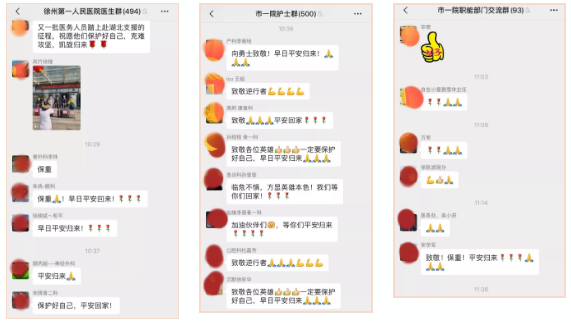 徐州市一院各工作群聽(tīng)聞第三批醫(yī)療隊(duì)?wèi)?zhàn)士逆行的信息后再次沸騰,接龍送上祝福,在線(xiàn)為白衣勇士壯行!
