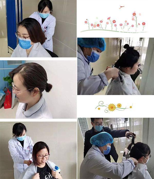 孔令娟、丁思艷、高鑫、李永麗、尹娜臨行前減去心愛的秀發(fā),堅(jiān)定抗擊疫情的斗志與信心。
