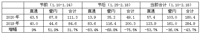 徐州普速站:2020年春運第1-40天發(fā)送人61.1萬人,日均1.6萬人,比去年春運同期減少75萬人,降幅53.2%。降幅最大的日期為2月11、12日、13日,分別下降90.9%、93.2%、92.2%。徐州東高鐵站:2020年春運第1-40天發(fā)送人80.4萬人,日均2.1萬人,比去年春運同期減少44.1萬人,降幅33.3%。降幅最大的日期為2月12、13日、14日,分別下降86.2%、87.4%、84.3%。今年臨客共開行159列,較去年308列下降了48.4%。