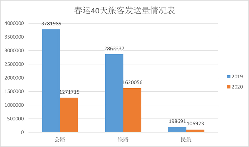 春運期間,受新型冠狀病毒感染的肺炎疫情影響,全市旅客發(fā)送量下降明顯。春運40天,全市累計安全發(fā)送旅客299.87萬人次,同比下降56.19%。其中:公路127.17萬人次,同比下降66.37%;鐵路162.01萬人次,同比下降43.42%;民航出港、中轉(zhuǎn)10.69萬人次,同比下降46.19%。