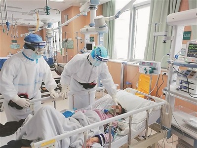 江蘇省人民醫(yī)院呼吸與危重癥醫(yī)學(xué)科副主任、主任醫(yī)師,武漢市第一醫(yī)院國(guó)家醫(yī)療隊(duì)聯(lián)合專家組組長(zhǎng)齊栩(右一)和同事在武漢市第一醫(yī)院重癥監(jiān)護(hù)病區(qū)給危重癥患者進(jìn)行檢查。