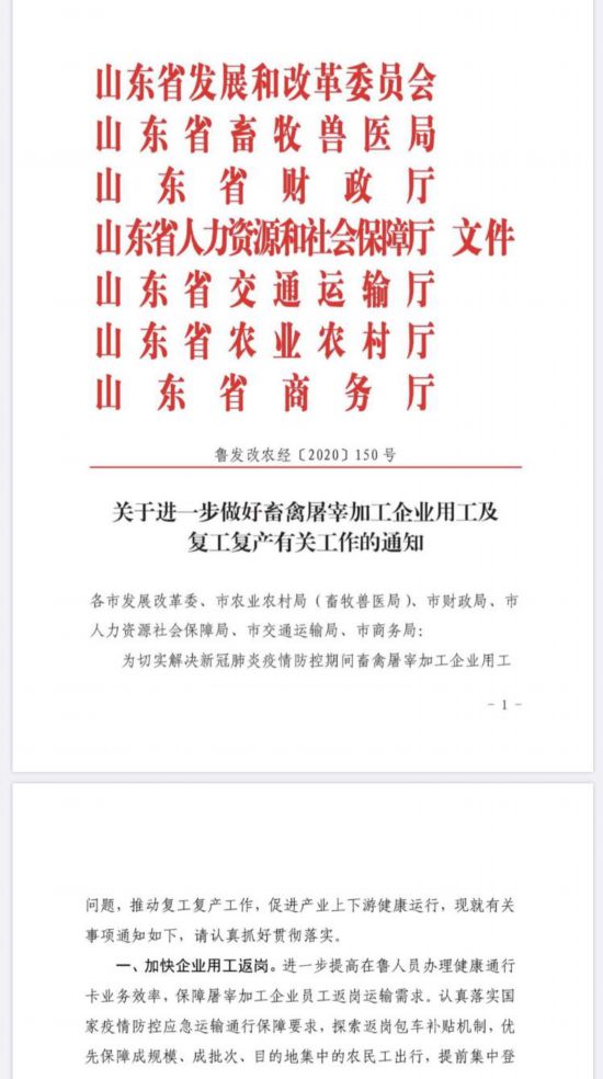 為切實(shí)解決新冠肺炎疫情防控期間畜禽屠宰加工企業(yè)用工問(wèn)題,推動(dòng)復(fù)工復(fù)產(chǎn)工作,促進(jìn)養(yǎng)殖業(yè)上下游產(chǎn)業(yè)鏈健康運(yùn)行,2月27日,山東省發(fā)展改革委等七部門聯(lián)合印發(fā)通知,就進(jìn)一步做好畜禽屠宰加工企業(yè)用工及復(fù)工復(fù)產(chǎn)有關(guān)工作,出臺(tái)八條針對(duì)性政策措施。