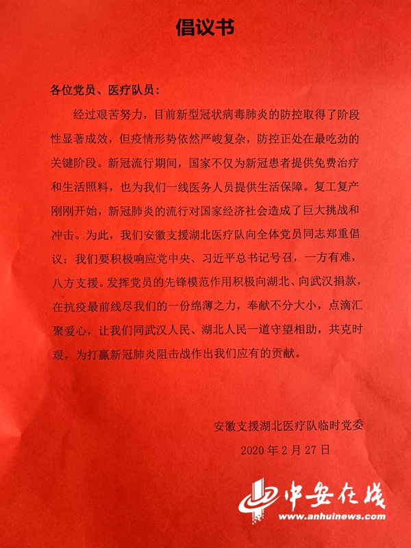 安徽援助武漢醫(yī)療隊員向湖北捐款