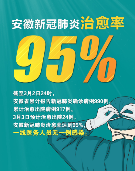 中安在線、中安新聞客戶端訊 截至3月3日,安徽省累計(jì)報(bào)告確診病例990例,累計(jì)治愈出院病例941例,治愈出院率達(dá)95.1%。治愈出院病例中,年齡最大的93歲,年齡最小的9個(gè)月。安徽16個(gè)市中,銅陵、六安兩市實(shí)現(xiàn)住院患者清零,其他市也在全力清零。(王佳)