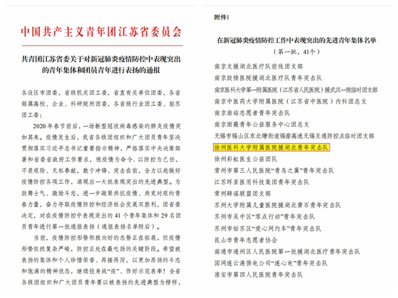 日前,共青團(tuán)江蘇省委發(fā)布關(guān)于對新冠肺炎疫情防控中表現(xiàn)突出的青年集體和團(tuán)員青年進(jìn)行表揚(yáng)的通報(bào)。徐州醫(yī)科大學(xué)附屬醫(yī)院援湖北青年突擊隊(duì)名列其中!