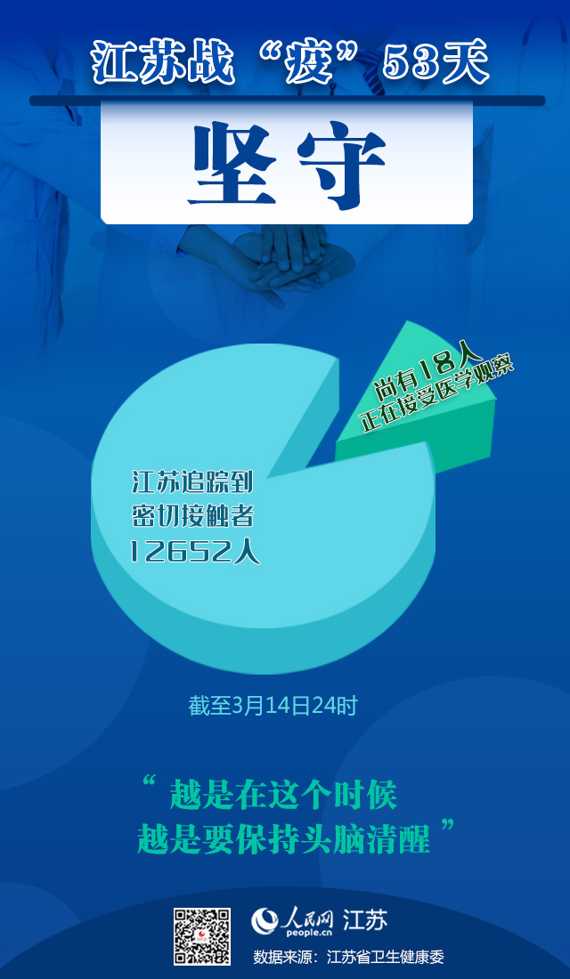 人民網(wǎng)南京3月15日電  (張妍)江蘇在院確診病例“清零”!3月15日,江蘇省衛(wèi)生健康委發(fā)布通報(bào),3月14日0-24時(shí),江蘇省無新增新型冠狀病毒肺炎確診病例,新增出院病例1例。這意味著,截至3月14日24時(shí),江蘇在院確診病例已全部出院。