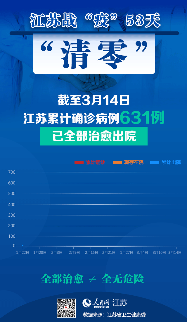 自1月22日國家衛(wèi)生健康委確認(rèn)江蘇首例新冠確診病例,江蘇共累計(jì)報(bào)告新型冠狀病毒肺炎確診病例631例,累計(jì)出院病例631例,確診病例零死亡,治愈率達(dá)100%。2月19日至3月14日,江蘇已連續(xù)25天無新增新冠肺炎確診病例。