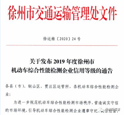 徐州運(yùn)管部門(mén)發(fā)布2019年度機(jī)動(dòng)車(chē)綜合性能檢測(cè)企業(yè)信用等級(jí)評(píng)定結(jié)果