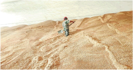 2019年夏糧收購后,東營市糧食和物資儲(chǔ)備有限公司工作人員將糧食入庫。(陳曉婉供圖)