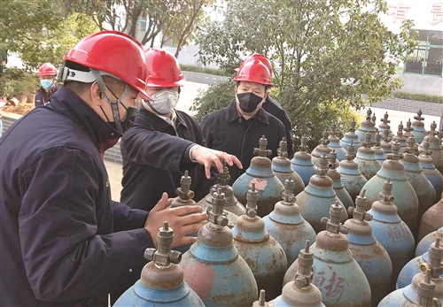 市場(chǎng)監(jiān)管人員對(duì)路友氣體廠氣瓶安全情況進(jìn)行檢查。