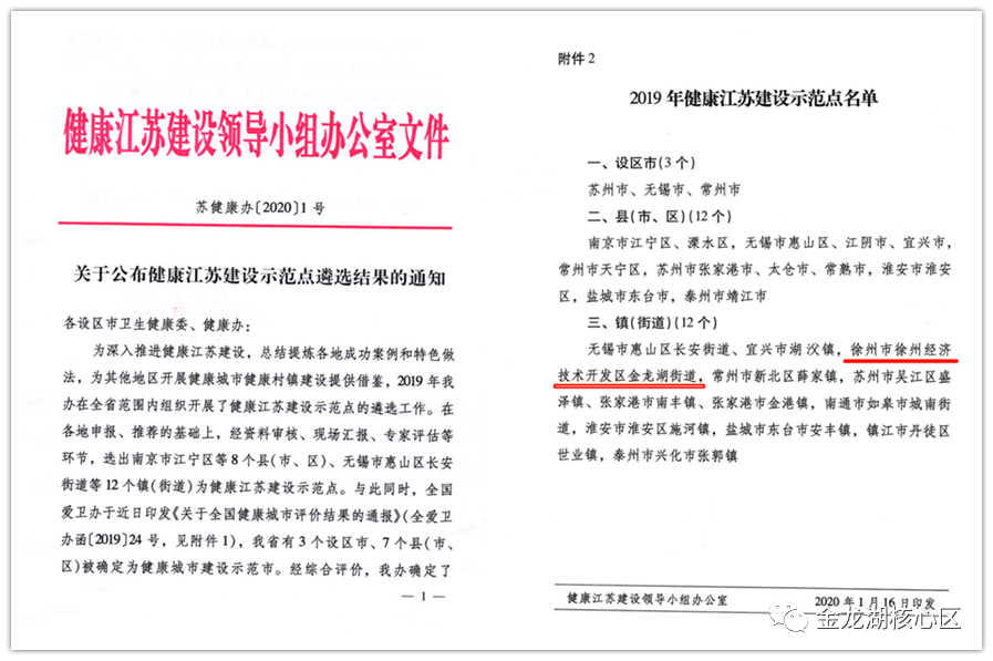 2020年1月,徐州經(jīng)開區(qū)金龍湖街道被健康江蘇建設(shè)領(lǐng)導(dǎo)小組辦公室遴選為“健康江蘇建設(shè)示范點(diǎn)”單位,全省僅12個(gè)鄉(xiāng)鎮(zhèn)(街道)入選,金龍湖街道成為徐州市唯一示范點(diǎn)單位。