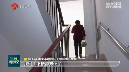 南京市建鄴區(qū)天順苑小區(qū)居民林玉琴說(shuō):“以前樓梯又黑又暗,安裝電梯以后,我們上下樓都方便了。”