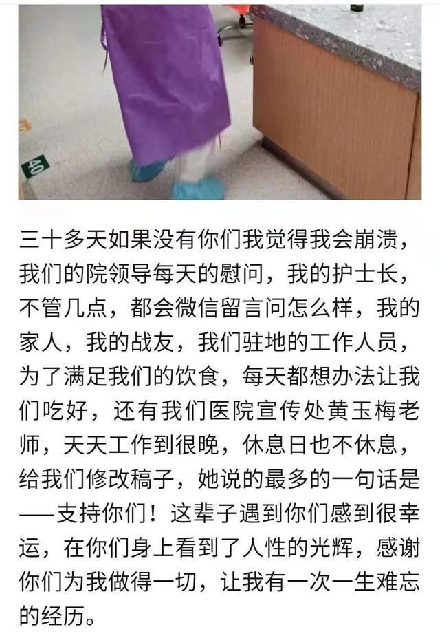就請(qǐng)我們走進(jìn)房娜,翻開(kāi)她的戰(zhàn)“疫”日記,傾聽(tīng)巾幗英雄用愛(ài)播下生命樹(shù)的“醫(yī)”路心語(yǔ):這是來(lái)武漢的第六天了,感覺(jué)很快,但是時(shí)間很短,每天的工作和安排都很充實(shí),每天的注意事項(xiàng)也很多,多到要在自己房間的每個(gè)地方都要寫上大字提醒自己!在臨床一線工作后,雖然我們每天做著和以前一樣平凡的工作,但是現(xiàn)在因?yàn)橛辛藢訉?ldquo;盔甲”的防護(hù),很難施展工作。就比如輸液,現(xiàn)在完全靠眼力和技術(shù)。有時(shí)候因?yàn)榉雷o(hù)面罩上有細(xì)小水滴,眼睛模糊了,就只能靠感覺(jué)了。有個(gè)老阿姨的血管比較不好,我看了半天,我說(shuō)阿姨,我不能保證一針搞定呀,最后一針見(jiàn)血成功穿刺靜脈留置針。阿姨說(shuō)“謝謝,我聽(tīng)著你的口音不是本地人呀?”我驕傲的跟她介紹,我是江蘇徐州的護(hù)理人員,武漢是我的第二故鄉(xiāng),我過(guò)來(lái)給“親人”支援的!阿姨表示非常感謝,謝謝你們,你們辛苦了,我們有難,也連累你們了!我笑笑,應(yīng)該的!一線疫區(qū)的工作雖然會(huì)給我很大的壓力,但是,得到病人的鼓勵(lì),得到領(lǐng)導(dǎo)的關(guān)心,得到家人的支持,得到同事們的鼓舞,一切的困難和壓力都能承擔(dān)!前方的路或許很坎坷,但作為一名黨員,作為一名醫(yī)務(wù)工作者,我一定不畏逆風(fēng)向前行,不懼風(fēng)險(xiǎn)勇?lián)?dāng)!在黨中央的堅(jiān)強(qiáng)領(lǐng)導(dǎo)下,我們團(tuán)結(jié)奮戰(zhàn),一定可以打勝仗!加油加油!