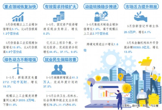 重點(diǎn)領(lǐng)域恢復(fù)加快。工業(yè)生產(chǎn)逐月提升,5月份規(guī)模以上工業(yè)增加值增長(zhǎng)5.1%;裝備工業(yè)加速向好,5月份實(shí)現(xiàn)增加值增長(zhǎng)15.8%;服務(wù)業(yè)生產(chǎn)效益穩(wěn)步向好。