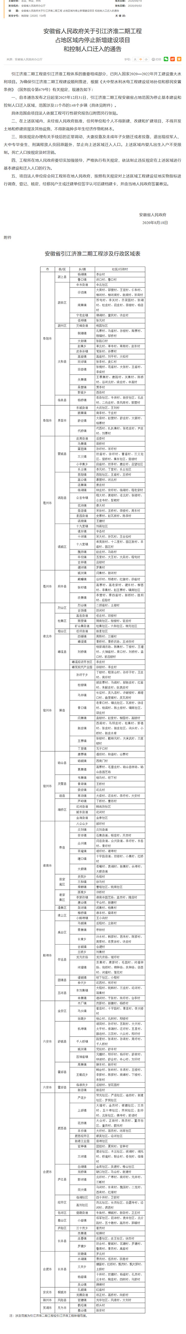 記者9月2日從安徽省人民政府網(wǎng)站上獲悉,安徽省人民政府發(fā)布關(guān)于引江濟(jì)淮二期工程占地區(qū)域內(nèi)停止新增建設(shè)項目和控制人口遷入的通告。自通告發(fā)布之日起至2025年12月31日,引江濟(jì)淮二期工程安徽省占地范圍為停止基本建設(shè)和控制人口遷入?yún)^(qū)域,范圍涉及11個市的148個鄉(xiāng)鎮(zhèn)(具體見附件)。