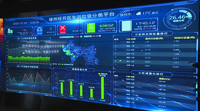 在金龍湖智慧園區(qū)體驗中心,生活垃圾分類平臺作為金龍湖綠網(wǎng)的子平臺,今年全新升級上線。在顯示大屏上,全區(qū)回收廚余垃圾噸數(shù)、減量化率、回收量排行及趨勢等數(shù)據(jù)一目了然。