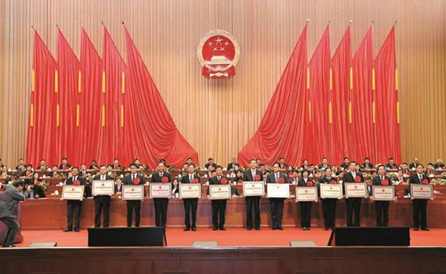 圖為全省抗擊新冠肺炎疫情先進(jìn)個(gè)人和先進(jìn)集體代表上臺(tái)領(lǐng)獎(jiǎng)。 本報(bào)記者 肖 勇 吳 勝 萬(wàn)程鵬攝