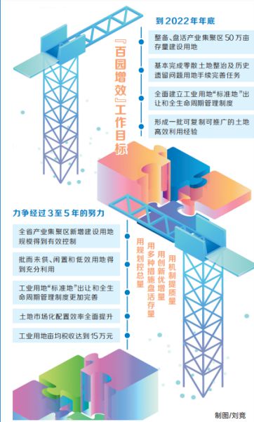 一是到2022年年底,整備、盤活產(chǎn)業(yè)集聚區(qū)50萬畝存量建設(shè)用地,基本完成零散土地整治及歷史遺留問題用地手續(xù)完善任務(wù),全面建立工業(yè)用地“標準地”出讓和全生命周期管理制度,形成一批可復(fù)制可推廣的土地高效利用經(jīng)驗。