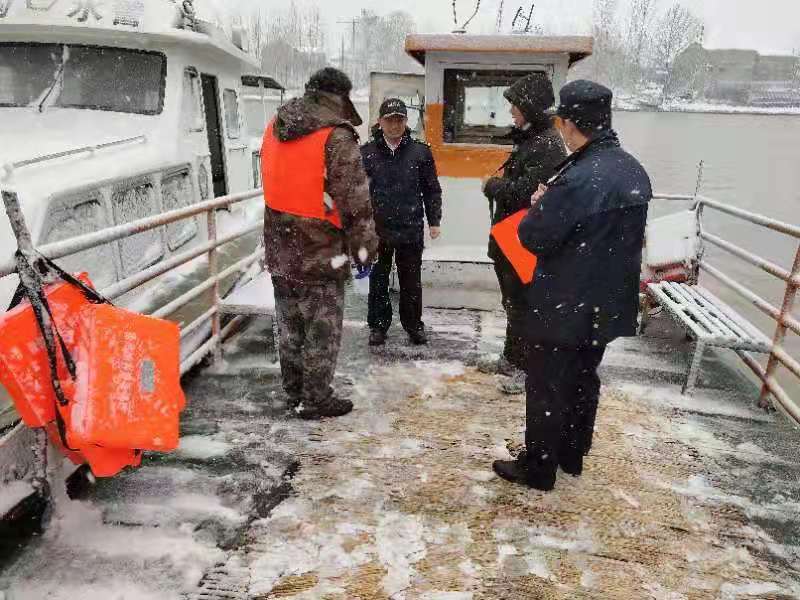 黃淮網(wǎng) 大雪來襲,徐州市地方海事局執(zhí)法人員冒雪對(duì)轄區(qū)學(xué)生渡——賈汪區(qū)大吳鎮(zhèn)瓦莊渡口開展現(xiàn)場(chǎng)巡查。要求渡口渡工及時(shí)清掃積雪,對(duì)碼頭,渡船采取拋撒爐渣,鋪設(shè)草墊等手段,確保防滑措施到位,保障群眾和學(xué)生過渡安全。