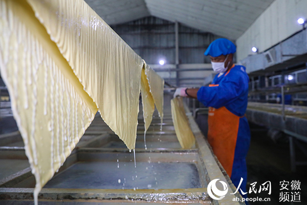 安徽紅花食品有限公司新鮮挑出的豆皮。人民網(wǎng) 張俊攝