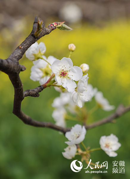 盛開的梨花與油菜花相映成趣。人民網(wǎng) 王曉飛攝
