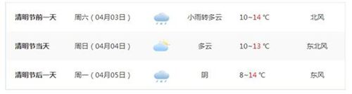根據(jù)天氣預(yù)報(bào),今年清明假期天氣雨轉(zhuǎn)多云,溫度在8-14℃。