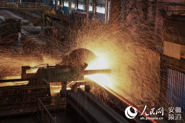 鋼材切割時(shí),四濺的火星猶如一幅畫。圖為馬鋼H型鋼生產(chǎn)線。人民網(wǎng) 王曉飛攝